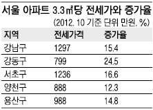 강남 3구의 평당 전세가격을 보면 강남구가 1297만원으로 가장 높고 서초구 1236만원, 송파구 1041만원 순으로 모두 1000만원을 넘었다. 용산구 988만원, 광진구 946만원, 중구 939만원, 마포구 903만원, 종로구 896만원, 양천구 888만원이었다.