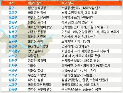 마포구 상암동 하늘공원에서는 대북 타고와 소원 빌기를 할 수 있고 송파구 방이동 올림픽공원 망월봉에서는 해울림 퍼포먼스와 축시 낭송, 해맞이 축가, 소원등 날리기를 할 수 있다.