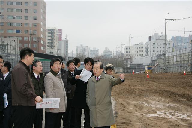 " title="박홍섭(오른쪽) 마포구청장이 19일 출근길에 구 간부들과 함께 새창고개 공원화 사업 부지를 찾아 현장을 점검하고 있다.