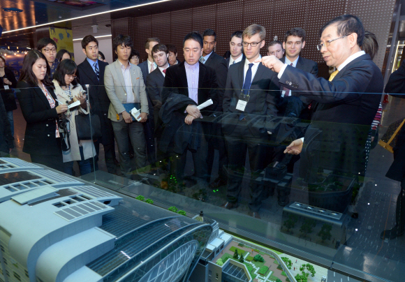 박원순(오른쪽) 서울시장이 21일 신청사를 방문한 미국 하버드대 케네디스쿨 공공정책대학원생 22명에게 신청사 모형을 보며 주요 시설 등을 설명하고 있다. 케네디스쿨은 매년 세계 각국의 정치·경제·문화 등을 소개하는 ‘스터디 트렉’(Study Trek)을 추진하고 있으며 올해는 한국을 방문국으로 정해 서울시를 비롯해 삼성전자, 현대차 등을 방문한다. 이 자리는 대학원생들이 관심 있는 한국 인사 중 1명으로 박 시장을 꼽아 마련됐다.