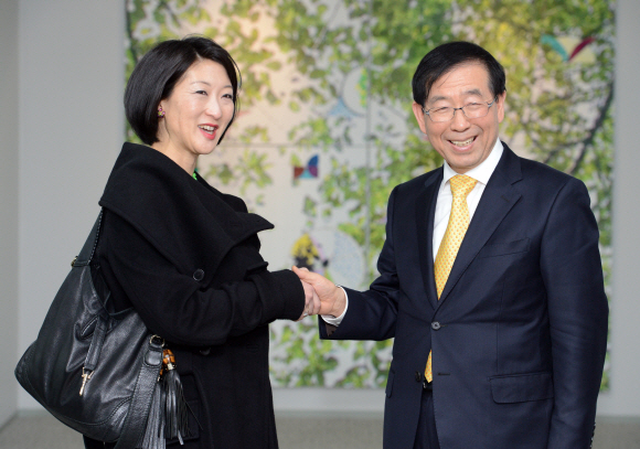 박원순(오른쪽) 서울시장이 25일 서울시청을 방문한 한국계 첫 프랑스 장관인 플뢰르 펠르랭 중소기업혁신디지털 경제부 장관과 면담에 앞서 악수하고 있다. 박 시장은 펠르랭 장관과 사회적 경제 활성화 방안에 대해 논의하고 서울시의 디지털 인프라를 소개했다.