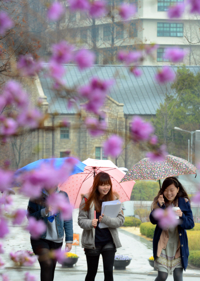 봄비가 촉촉하게 대지를 적신 2일 서울 서대문구 이화여대에서 학생들이 진달래가 활짝 핀 교정을 걸으며 즐거워하고 있다.