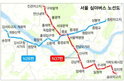 강서~중랑 ‘N26번’·은평~송파 ‘N37번’ ...19일부터 오전 4시 55분까지