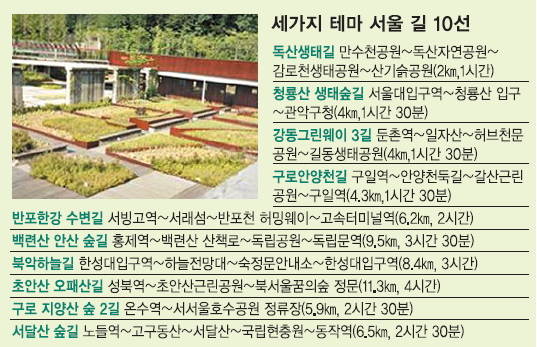 아이들과 함께 봄소풍 가듯 가볍게 산책할 수 있는 ‘아이들과 소풍가는 길’에는 독산 생태길, 청룡산 생태숲길, 강동그린웨이 3길 코스가 있다. ‘강변 불어오는 봄바람에 설레는 길’에는 구로 안양천길, 반포한강 수변길이 뽑혔다. ‘꽃향기 가득한 역사문화 숲길’로는 백련산 안산 숲길, 초안산 오패산길, 북악 하늘길, 구로 지양산 숲2길, 서달산 숲길을 손꼽았다.