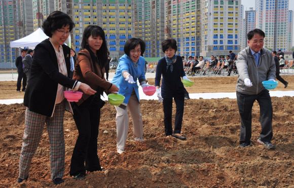 박춘희(왼쪽에서 세번째) 송파구청장이 6일 위례신도시 1공구9블록 건설현장에서 열린 유채꽃 파종식에 참가해 씨앗을 뿌리고 있다.