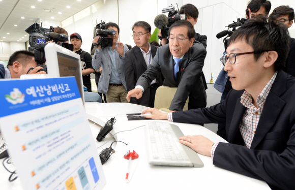 예산낭비 꼼짝마!  박원순(오른쪽에서 두 번째) 서울시장이 13일 서울시청 열린민원실에 개설된 예산낭비신고센터를 찾아 민원인과 대화하고 있다.<br>정연호 기자 tpgod@seoul.co.kr