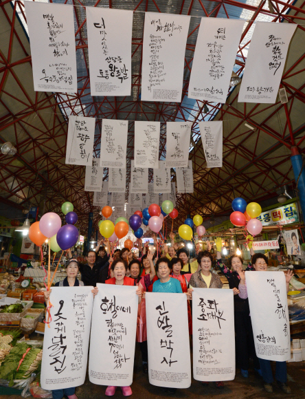 23일 서울 중구 황학동 신당중앙시장에서 열린 ‘황학동별곡 100인 이야기’ 개막식에서 상인들이 대형 칼리그래피(서예)를 들고 시장발전을 기원하고 있다. 황학동별곡은 신당창작아케이드가 모은 상인 100명의 이야기를 칼리그래피 작품으로 전시하는 축제다.