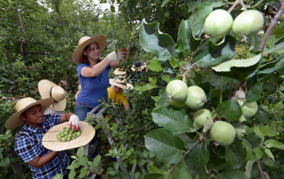 외국인 유학생 사과 솎아내기 체험  19일 서울 성동구 서울숲 영주사과길에서 외국인 유학생들이 열매 솎아내기(적과작업) 체험을 하고 있다. 크고 좋은 열매를 얻기 위해 한 가지에 4~5개만 남겨 두고 나머지는 모두 따내는 작업이다.<br><br>정연호 기자 tpgod@seoul.co.kr