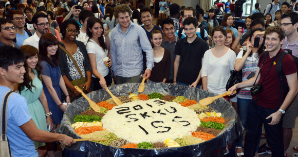 성균관대 국제하계학기에 참가하고 있는 외국인 학생들이 10일 서울 종로구 성균관대 600주년 기념관 조병두홀에서 열린 ‘한국고유음식 만들기’ 행사에서 대형 비빔밥을 만들고 있다.