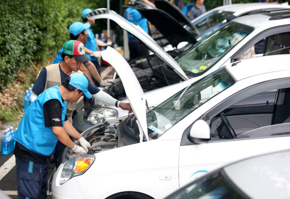 서울 노원구청 주관으로 10일 중계근린공원 공영주차장에서 정비사들이 휴가철 자동차 무상 안전점검을 실시하고 있다. 오전 10시부터 오후 5시까지 브레이크 및 라이트 전구 이상 여부, 윈도 브러시 작동 상태, 미션오일 등 안전 운행에 필요한 23가지 항목을 점검했다.