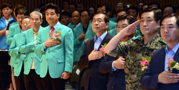15일 서울시청 8층 다목적홀에서 열린 서울시 자율방재단연합회 발대식에 참석한 박원순(앞줄 오른쪽 네 번째) 서울시장과 연합회 관계자들이 국민의례를 하고 있다. 자율방재단은 활동 지역의 순찰로 위험 요소를 찾아내 사고 발생을 방지하고 재난 현장 복구와 구호활동을 펼치는 자발적인 시민 모임이다.