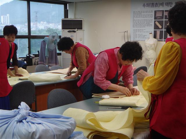 지난 22일 동대문구 장안동 구민회관 4층 봉제실에서 10여명이 구슬땀을 흘리며 삼베에 한 땀 한 땀 바느질을 하고 있었다. 이들은 여성복지관의 생활한복반을 수강한 주민들로 지역 노인들을 위해 직접 수의(壽衣)를 만든다. 4~5년간 구 여성복지관 생활한복반에서 바느질을 배우면서 돈독해진 수강생 10여명이 2009년부터 ‘수의사랑나눔봉사단’을 만들었다. 자신들의 재능을 지역에 돌려주려는 것이다.