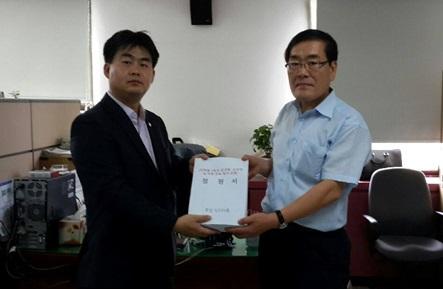 김동현(왼쪽) 서울 강남구의원이 지난 15일 주민의 염원을 담은 서명을 서울메트로 관계자에게 전달하고 있다.