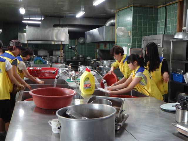 봉사단 일행은 부모님과 떨어져 여자 성인방, 남자 성인방, 빨래방, 주방 등 각자 선택한 배치 장소에서 열심히 일했다. 여름철이라 비릿하고 역한 냄새를 풍기는 화장실과 방 청소를 하던 김정민(17·대광고1년)군은 “엄마가 지금 내가 청소하고 있는 것을 보면 배신감이 들지도 모른다”면서 “순수한 어린아이 같은 이곳 어른들에게 도움이 된다니 힘들지만 보람차다”고 말했다.