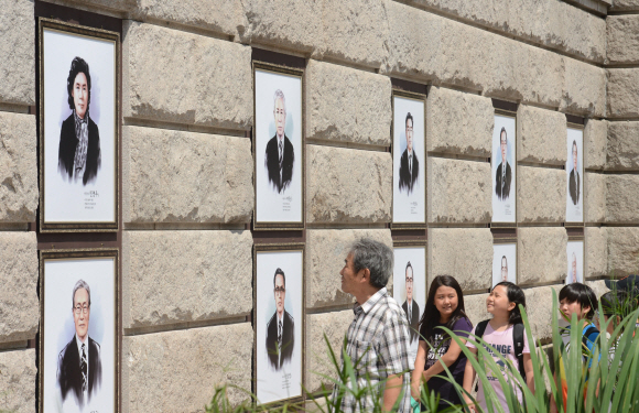 15일 서울 중구 서울도서관 외벽을 이용해 열린 서울시에 사는 ‘현존 애국지사 37인 사진전’을 시민들이 관람하고 있다.