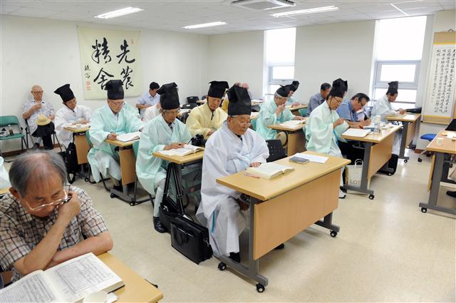 무더위가 기승을 부리던 지난 21일 오전 11시 동대문구 전농2동 주민자치센터 4층에선 단정한 유생복을 한 백발 선생님과 또래 학생들이 마치 타임머신을 타고 조선시대로 건너간 듯한 풍경을 연출했다. 윤렬상(76) 성균관유학대학원 교수가 고문과 한시 등 열띤 강의를 이어가는 가운데 수강생 40여명이 중용(中庸)을 익히며 만학의 열정을 태우고 있었다. 수강생이 해당 부분을 음독과 함께 읽으면 윤 교수가 쉽게 풀이한 후 한 줄씩 흥취나 리듬을 넣고 다시 읽었다.