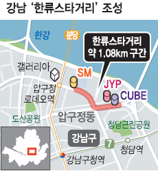 신연희 강남구청장은 27일 서울시청 브리핑룸에서 “2015년까지 단계적으로 압구정동 갤러리아백화점~SM엔터테인먼트~큐브엔터테인먼트에 이르는 1.08km 구간을 한류스타 거리로 정하고 스토리가 있는 장소에 찾아가서 직접 체험할 수 있는 ‘도심판 올레길’로 만들 계획”이라고 밝혔다. 아모레퍼시픽이 브랜딩·심벌·거리이정표(Signage) 등 디자인 기획 및 개발을, 제이콘텐트리 M&B가 스토리텔링을 재능기부 형태로 제공하는 등 민관 협력의 산물이라 의미를 더한다.