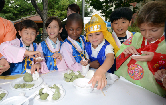12일 서초구 반포동 은행나무공원에서 구 주최로 열린 한·불 어린이와 함께하는 추석 전통 한마당에 한복을 입고 참가한 양국 어린이들이 송편을 빚으며 즐거워하고 있다.