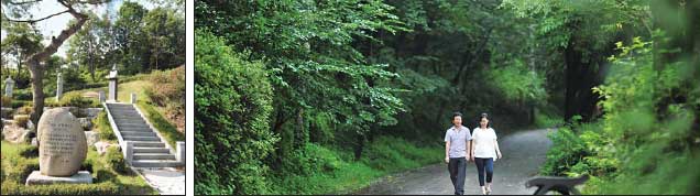 중랑구 제공" title="서울 중랑구 망우리공원묘지에 있는 죽산 조봉암의 묘 입구. 연보비 옆 계단으로 올라가면 된다(왼쪽). 망우리공원묘지에 조성된 ‘사색의 길’(오른쪽), 역사적 인물들이 몸을 누인 이곳의 짙은 숲길이 인상적이다.