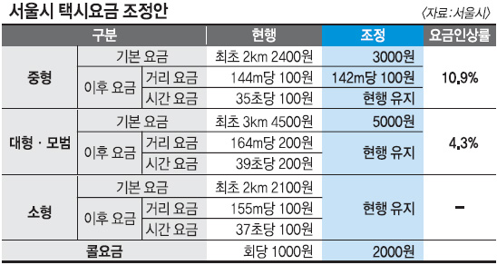 이번 택시 요금 인상은 4년 4개월 만이다. 중형택시 거리 요금은 144m당 100원에서 142m당 100원으로 조정된다. 시 인근 11개 도시로 이동 시엔 시외 할증 요금이 부활한다. 콜택시의 콜 이용료(1000원)는 심야(밤 12시~오전 4시) 시간에 2000원으로 인상된다.