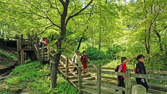 시민들이 15일 아차산 생태공원 나무 계단을 오르내리며 고구려 흔적을 돌아보고 있다.