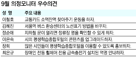 서울신문과 서울시의회가 함께하는 9월 의정모니터에서는 불편한 시정에 대한 쓴소리가 쏟아졌다. 특히 시민의 발인 지하철 관련 의견이 많았다. 시민 제안 45건 중 교통위원회 4건, 행정자치위원회 2건 등 6건을 최우수 의견으로 선정했다. 교통위원회 4건 가운데 3건은 불편한 교통 안내표시판에 대한 지적이었다.