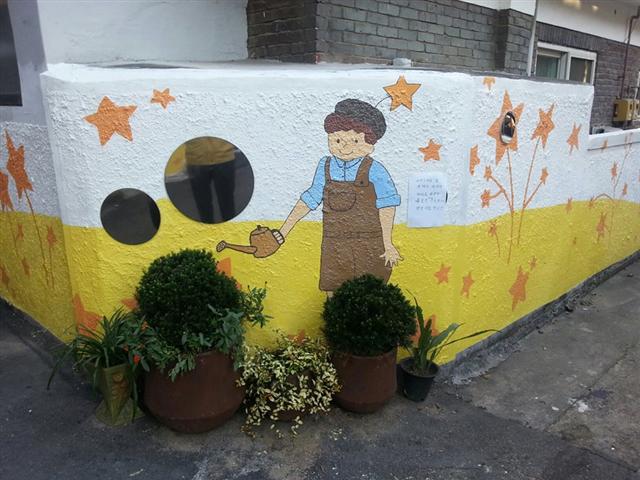 관악구 인헌동 인헌13길에 새로 조성된 별꽃길 담벼락으로 그림 속 사람이 물을 주는 모습과 실제로 앞에 놓인 화분이 절묘하게 조화를 이뤘다.