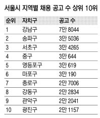강남구 채용 공고가 모두 7만 8044건 올라와 1위를 차지했다. 송파구(3만 5036건), 서초구(3만 4265건)가 뒤를 이었다. 강남 3구 채용 공고는 전체의 25.5%를 차지했다. 도봉구가 9576건으로 가장 적었다.