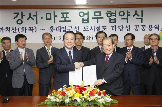 서울 강서구와 이웃인 마포구가 서부 경전철 노선연장 사업에 속도를 내기 위해 손을 맞잡았다.