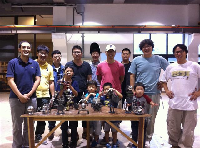 회사원 권청구(41)씨는 어느 날 아이와 함께 로봇을 만드는 기회를 알리는 인터넷 카페 공지를 봤다. 마침 아들 민재(7)도 한창 로봇에 관심을 보일 시기라 곧바로 참가 신청을 했다. 굴러다니는 고철 쓰레기 가운데 재료를 골라 아이와 함께 직접 만들어 보는 것도 의미가 있을 것 같았다. 평일 저녁 한 차례 사전 모임을 가졌다. 문래동을 근거로 활발한 활동을 펼치는 안경진 조각가가 나와 로봇 디자인과 재료 준비를 거들었다. 같은 주 토요일 반나절 동안 아빠와 아들은 고철과 씨름했다. 용접 등 전문적 작업은 도움을 받았다. “아빠, 이렇게 만들면 어떨까?” 서로 의견을 주고받으며 땀흘린 끝에 약간 투박하지만 정성이 가득 담긴 작은 로봇이 탄생했다. 권씨는 “아이가 로봇을 만들며 무척 즐거워했다. 나이가 엇비슷한 동네 형, 동생과 어울릴 수 있어 더 좋아했다”고 웃었다.