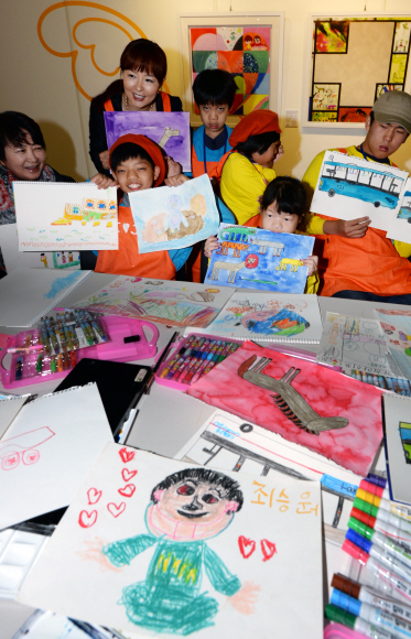 30일 서울 종로구 홍대아트센터 갤러리블루에서 중외학술복지재단 주최로 열린 장애인 특별전에서 학생들이 자신이 그린 그림을 들어 보이고 있다. 전시회는 다음 달 4일까지 열린다.