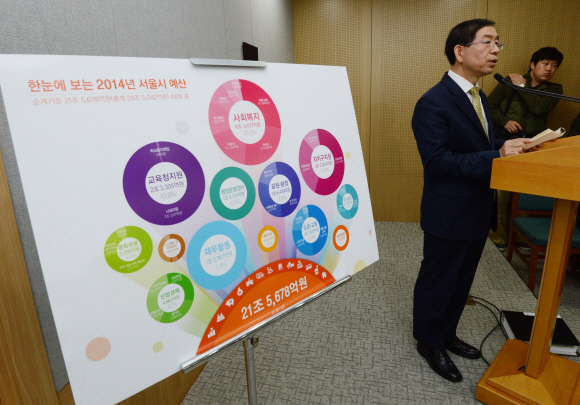 2014년 예산에 가장 큰 부분은 7조원에 달하는 ‘복지예산’이다. 세수 감소로 시의 재정여건이 좋지 않은 상황에도 무상보육과 기초연금 등 정부 복지확대에 따라 예산이 늘었다. 사회복지 예산을 6조 9077억원으로 편성해 지난해 6조133억원보다 9000억원 가까이 늘렸다. 전체 예산에서 차지하는 비중은 32%다. 박 시장은 복지사업이 너무 과도한 것이 아니냐는 지적에 “시민들의 삶의 질이 더 나아져야 한다고 생각한다”면서 “복지예산은 점진적으로 계속 확대돼야 한다”고 말했다.
