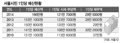 한편 내년에 서울시민 1명이 부담할 세금은 121만 7000원으로 전국 17개 광역단체 가운데 세종시에 이어 2위이다. 시민 1명에게 편성된 예산은 166만원이고, 1인당 채무액은 29만 5000원으로 6000원 늘어날 것으로 추산된다.