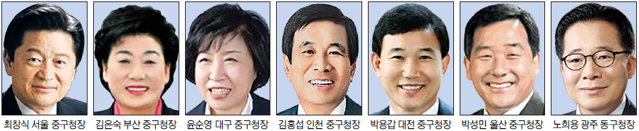 이날 오전 11시에 열리는 ‘제24차 전국 대도시 중심구 구청장 협의회’에는 최창식 서울 중구청장을 비롯해 김은숙 부산 중구청장, 윤순영 대구 중구청장, 김홍섭 인천 중구청장, 박용갑 대전 중구청장, 박성민 울산 중구청장, 노희용 광주 동구청장이 나선다.