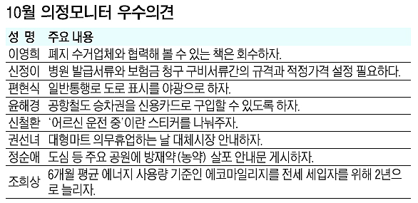서울신문과 서울시의회가 함께하는 10월 의정모니터에는 불편한 시정을 꼬집는 제안이 쏟아졌다. 지난달 접수된 49건을 심사위원 6명이 심의해 8건을 우수의견으로 꼽았다.