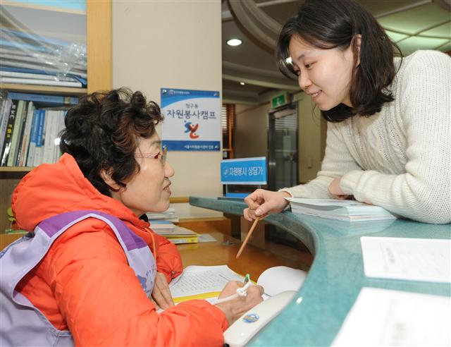 4일 서울 중구 청구동 주민센터 내 자원봉사캠프에서 상담사가 자원봉사를 지원하는 주민에게 활동 등에 대해 설명하고 있다.