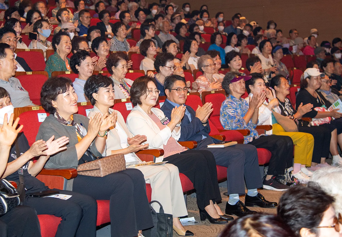박희영(첫 번째 줄 왼쪽 네 번째) 서울 용산구청장이 지난 12일 용산아트홀 대극장 미르에서 열린 개관 기념행사를 관람하고 있다.