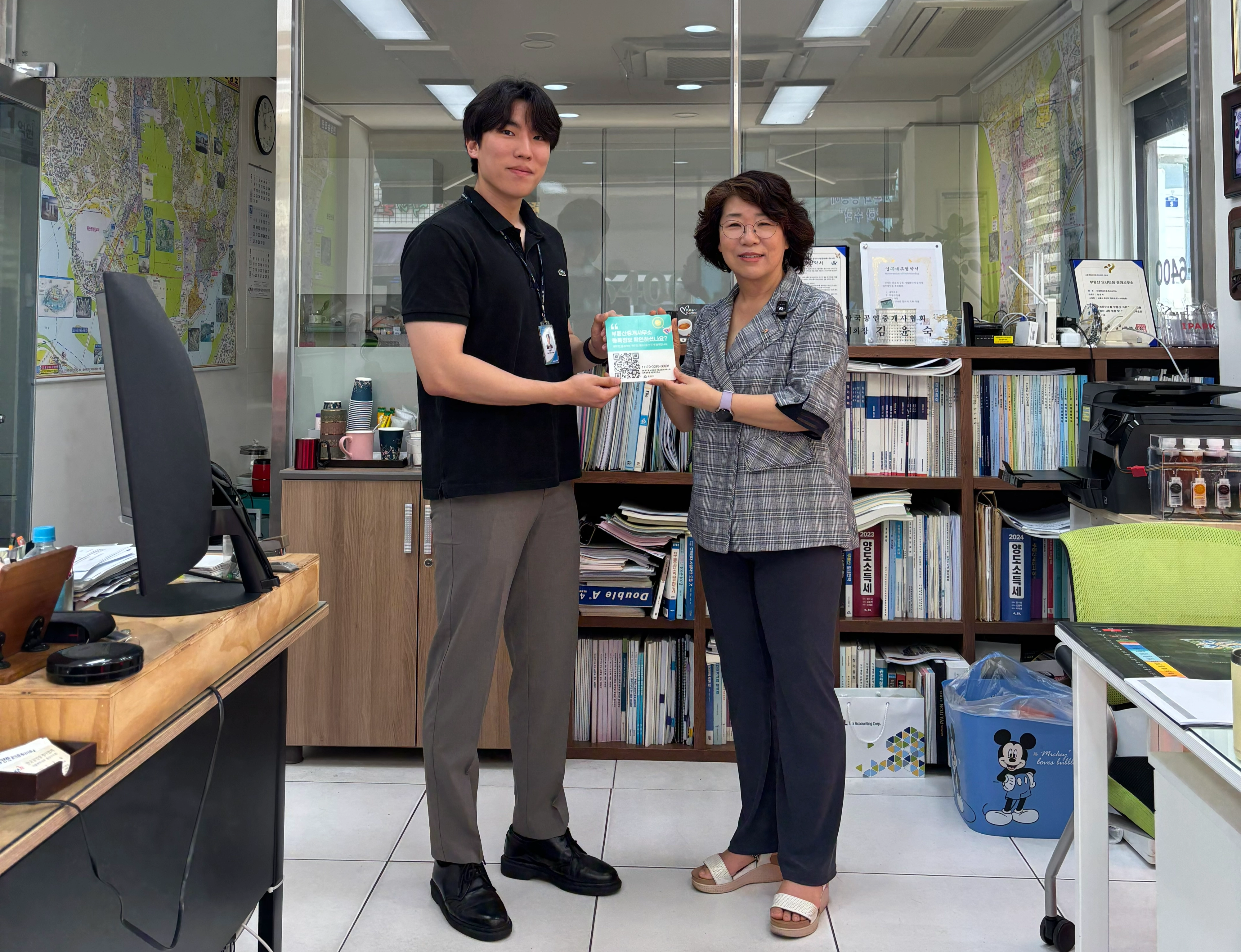 서울 용산구 관계자가 부동산중개사무소에 등록정보 정보무늬 명패를 전달하고 있다.
