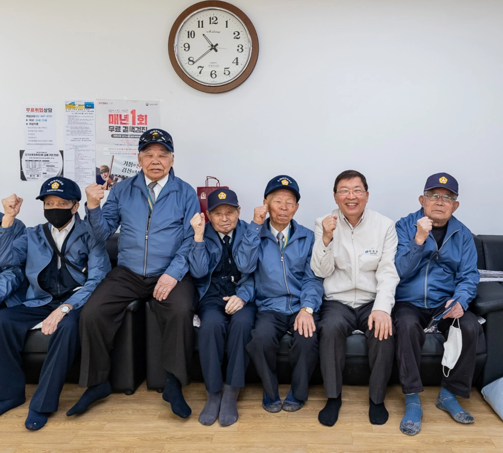 김경호(오른쪽 두 번째) 서울 광진구청장이 국가유공자 경로당에서 기념사진을 찍고 있다.