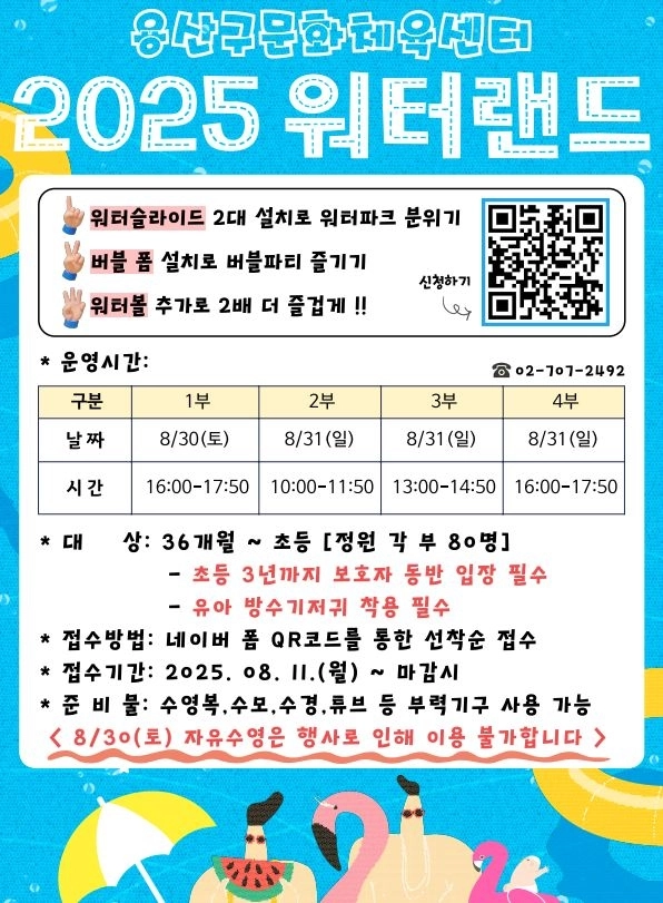 서울 용산구는 ‘약자와의 동행’ 일환으로 오는 8월 30일부터 31일까지 이틀간 용산구문화체육센터 수영장에서 ‘워터랜드’ 행사를 연다고 20일 밝혔다.