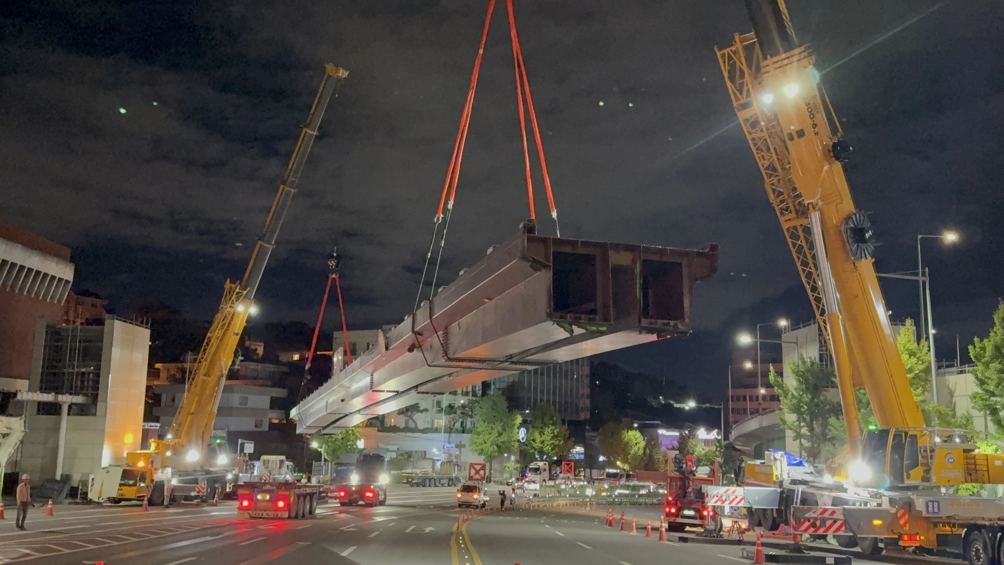 보도육교 철거는 9월 15일부터 27일까지 총 14일간 진행된다. 특히 20~21일 야간 집중 작업에는 구조기술자, 장비 운전자, 신호수, 산소공 등 약 50여 명의 인력과 300t·250t·50t급 대형 크레인 3대, 트레일러 등 중장비 18대가 투입됐다.