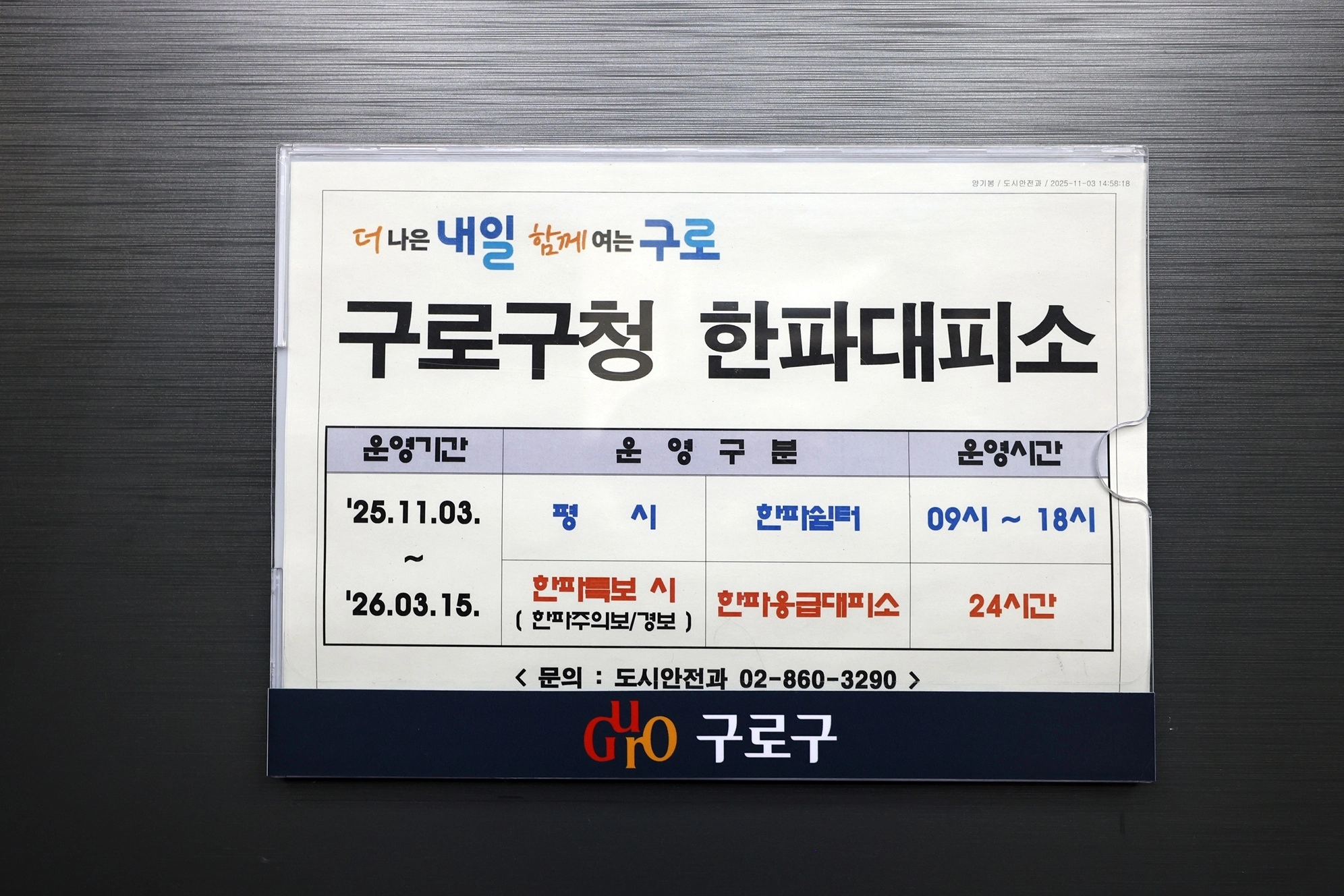 한파쉼터 및 응급대피소 위치와 운영시간 등 자세한 사항은 구로구 홈페이지를 통해 확인할 수 있으며, 문의는 도시안전과(02-860-3290)로 하면 된다.