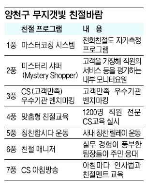 일곱가지 프로그램으로 이뤄져 ‘무지갯빛 친절바람’이라고 이름 붙인 친절 서비스는 ‘마스터코칭 시스템’, ‘미스터리 샤퍼(Mystery Shopper)제’, ‘CS(고객만족) 우수기관 벤치마킹’, ‘맞춤형 친절교육’, ‘칭찬합시다 운동’, ‘친절매니저’, ‘CS아침방송’ 등이다.