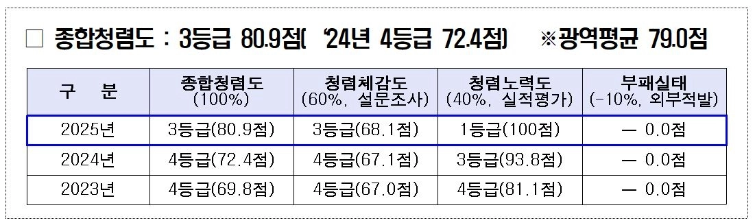 청렴 문화 확산 노력 결실 역대 최고 성적… 종합 청렴도는 3등급으로 상향