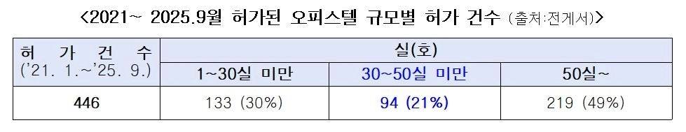 한편, 2021년부터 2025년 9월까지 허가된 서울시 오피스텔 446건을 실(室) 규모별로 분석한 결과, 30실 미만 오피스텔은 133건으로 전체의 약 30%를 차지했으며, 이번 조례 개정으로 심의기준이 완화되는 30실 이상 50실 미만 오피스텔은 94건으로 약 21%에 해당하는 것으로 나타났다.