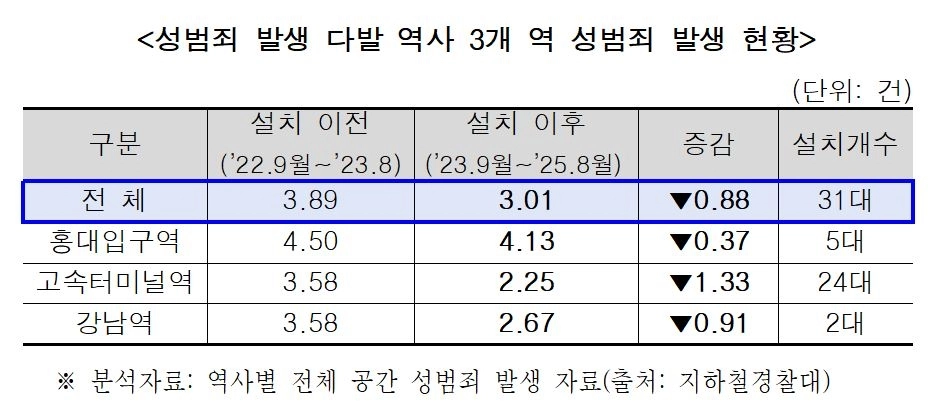 제출된 자료에 따르면 성범죄 발생이 잦은 주요 혼잡역사인 홍대입구역·고속터미널역·강남역의 안심거울 설치 이전(2022년 9월~2023년 8월)과 이후(2023년 9월~2025년 8월)의 성범죄 발생 현황을 비교한 결과, 역사별 성범죄(촬영·추행) 발생 건수가 월평균 3.89건에서 3.01건으로 0.88건 감소해 약 22.6% 줄어든 것으로 나타났다.