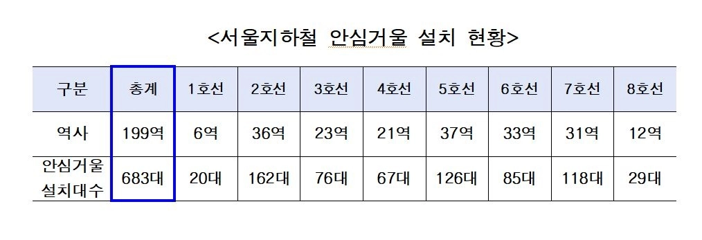 현재 서울시하철 안심거울은 총 199개 역사에 683대 설치 중이다.