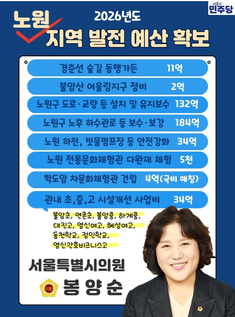 서울시의회 봉양순 의원(더불어민주당, 노원3선거구)은 2026년도 서울시 본예산에 총 400억여 원 규모의 노원구 지역발전 예산을 확보했다고 밝혔다.