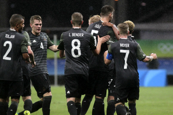 독일 선수들  독일은 5일(한국시간) 브라질 사우바도르 폰치 노바 경기장에서 열린 멕시코와의 2016 리우데자네이루 올림픽 남자축구 C조 1차전에서 마티아스 긴터의 동점골에 힘입어 2-2로 비겼다.<br>사진=AP 연합뉴스