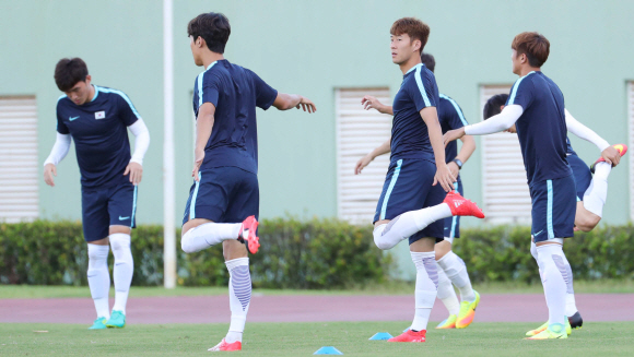 2016년 리우올림픽 남자축구 손흥민이 6일 오후(현지시간) 브라질 사우바도르 피투아쿠 경기장(Pituacu stadium)에서 피지컬 셔킷 트레이닝을 하고 있다.